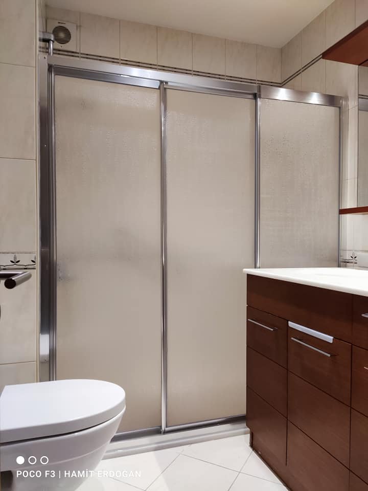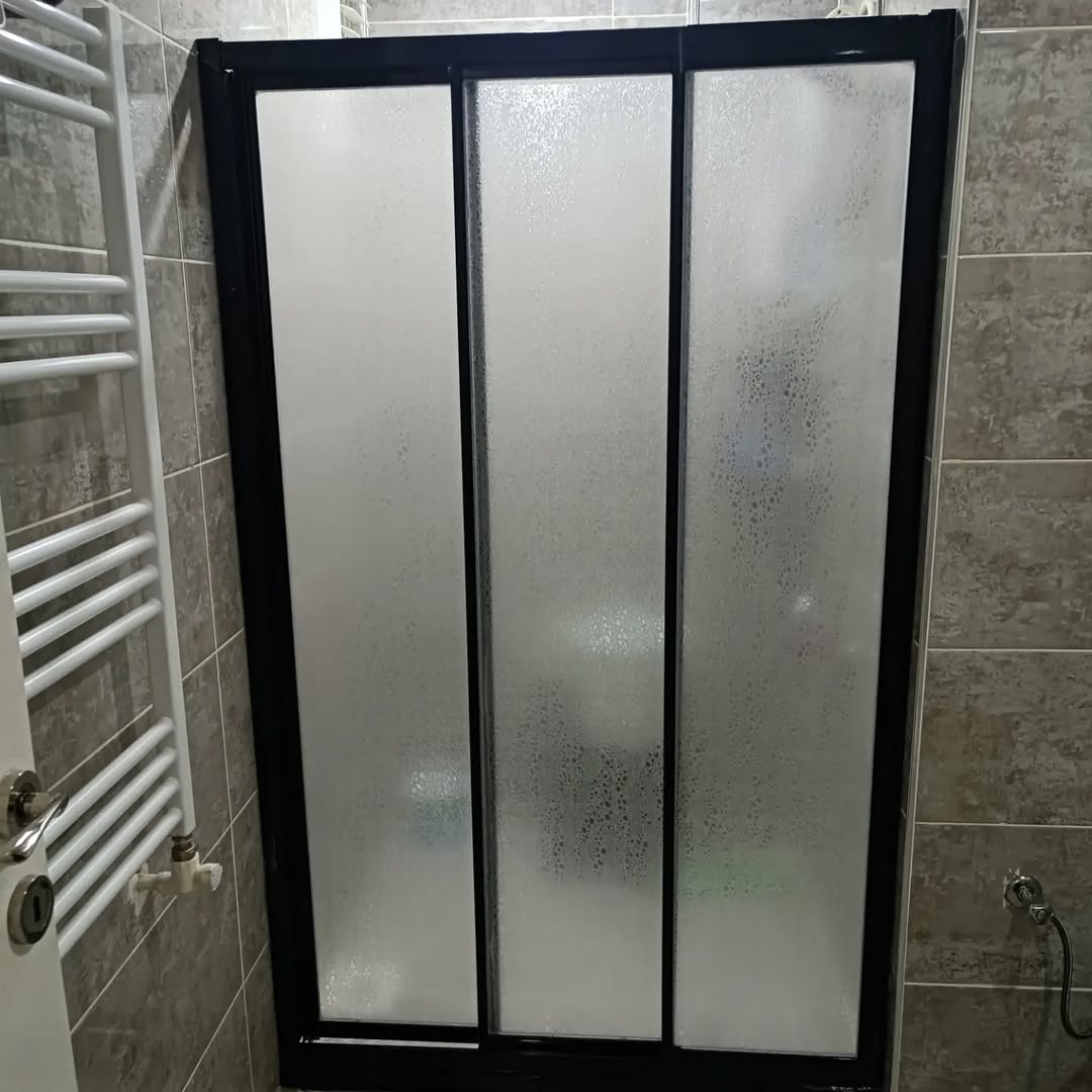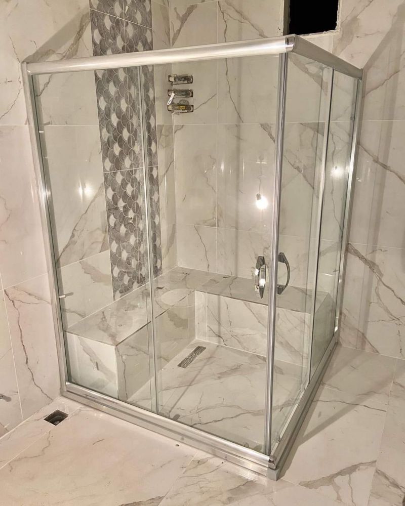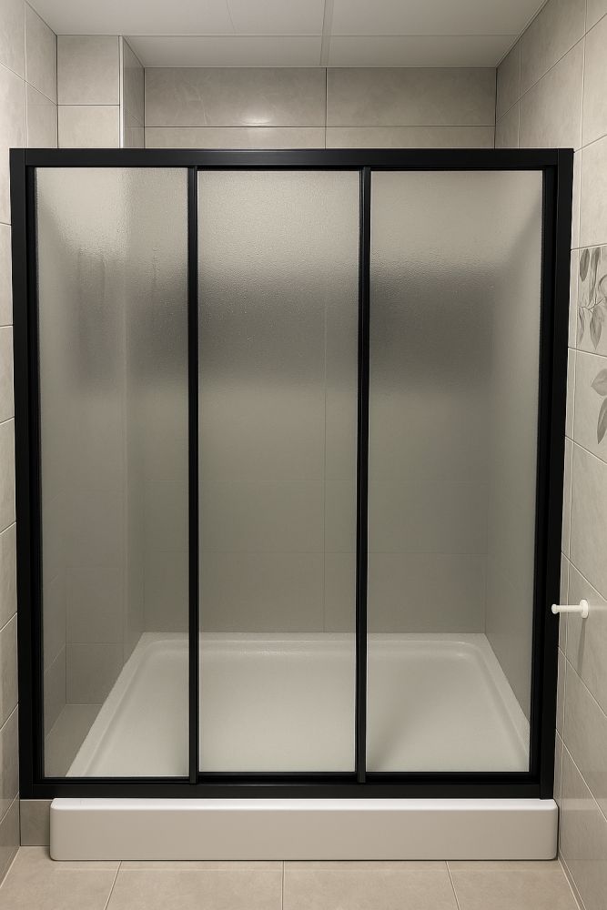 Modern banyolar için tasarlanan İki Duvar Arası Mika Camlı Duşakabin (Üçlü Sistem), 1 sabit ve 2 sürgülü panelden oluşan pratik kapı