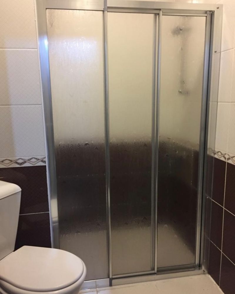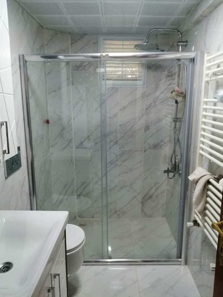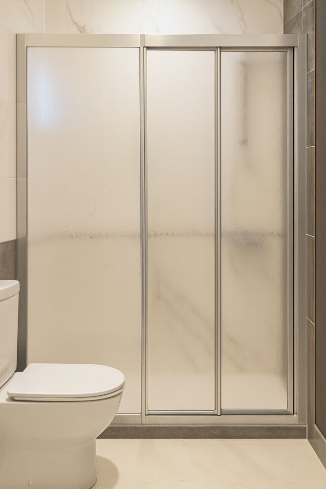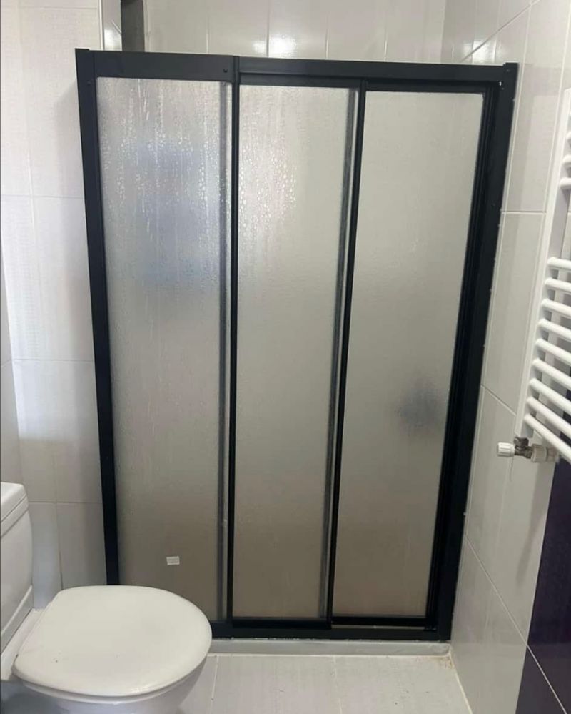 Modern banyolar için tasarlanan İki Duvar Arası Mika Camlı Duşakabin (Üçlü Sistem), 1 sabit ve 2 sürgülü panelden oluşan pratik kapı