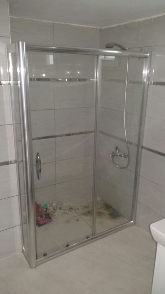 Lüks Camlı Duşakabin + Düz Duş Teknesi ND107, tam size göre. İki duvar arası alanlar için özel olarak tasarlanan bu model, 1 sabit ve 1 kayar kapılı