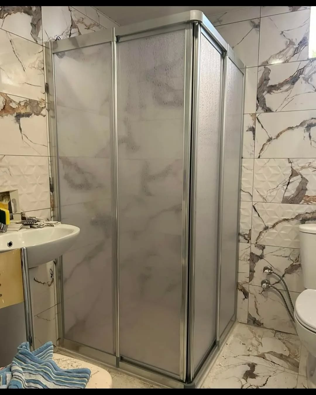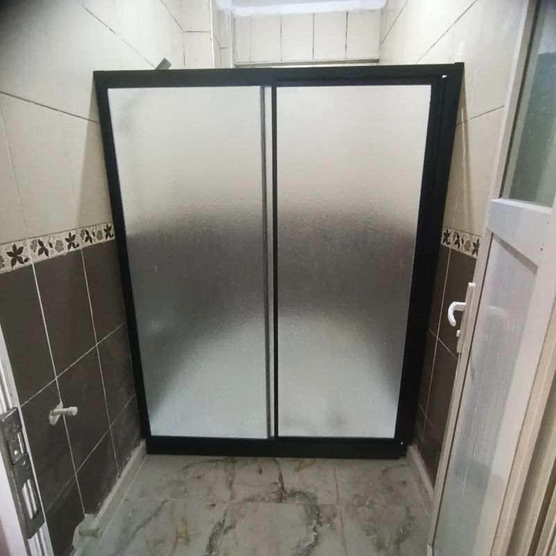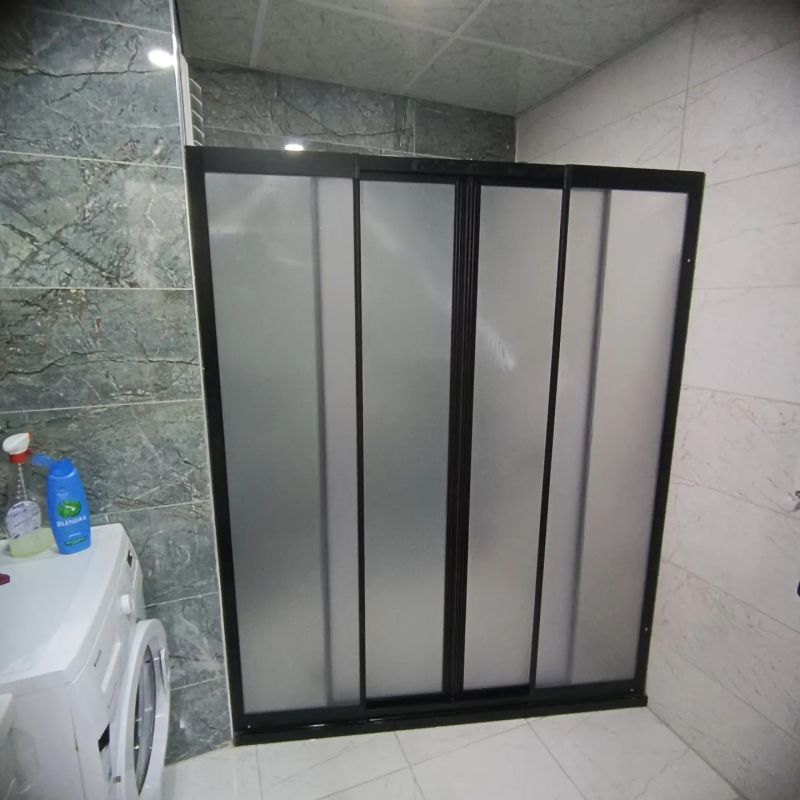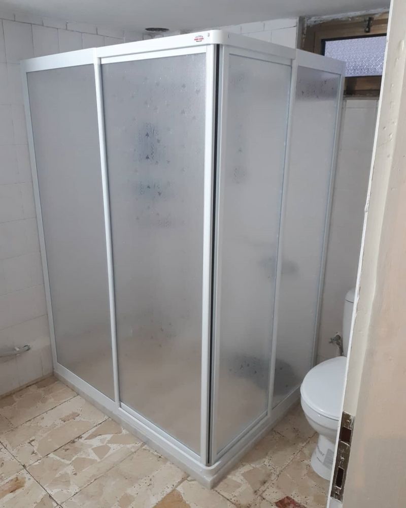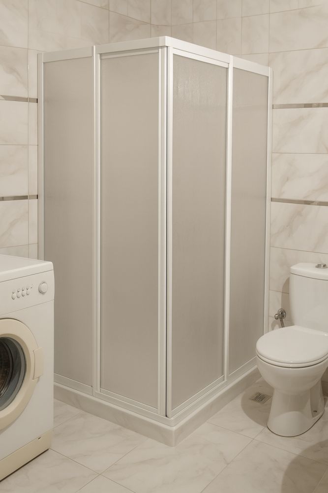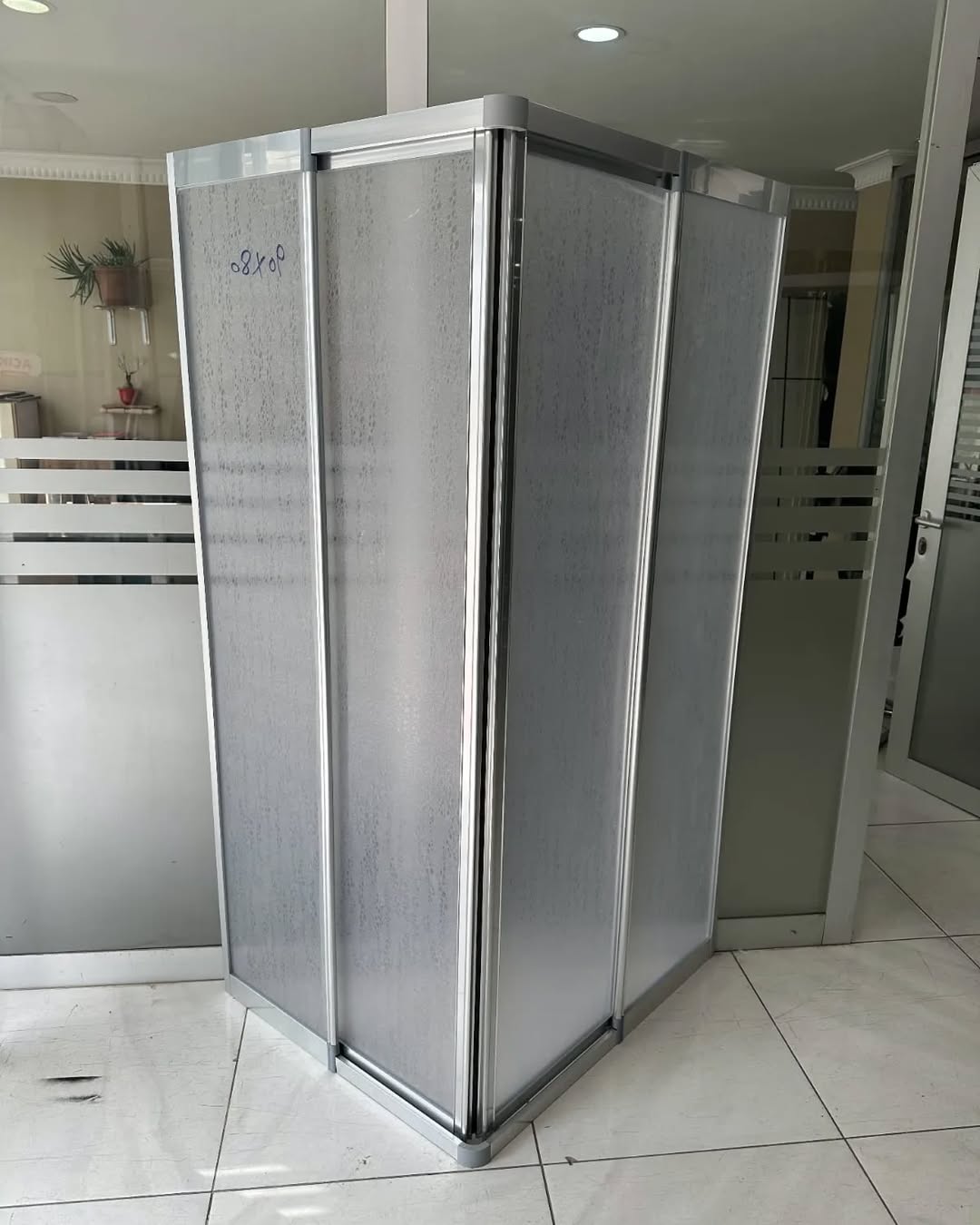 Kare mika plastik camlı duşakabin, sade tasarımı ve dayanıklı alüminyum profiliyle modern banyolara şıklık katar