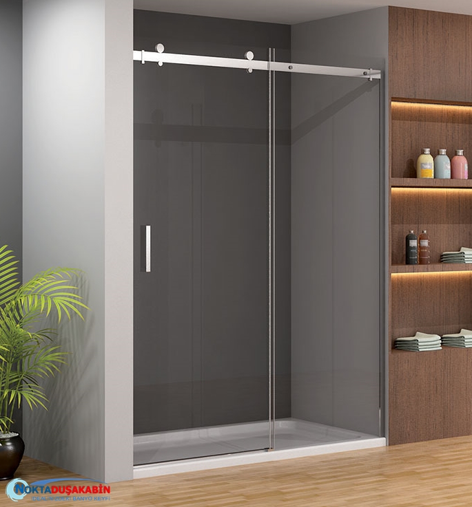 Lüks Camlı Teknesiz Duşakabin ND112, iki duvar arası uygulanabilen 1 sabit + 1 sürgülü kapılı yapısıyla, modern banyolarda yer tasarrufu ve estetik gö