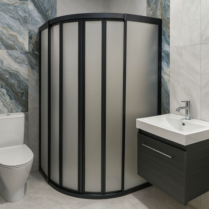 Modern banyolar için zarif çözüm! Teknesiz Mika Siyah Profil Oval Duşakabin, kavisli tasarımı ve buzlu cam yapısıyla ferahlık sağlar.